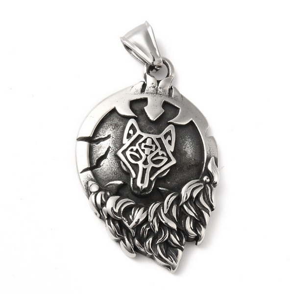 Pandantiv otel inoxidabil 304, argintiu antichizat, nod Viking si cap de lup, 43.5x28x6mm 1 buc