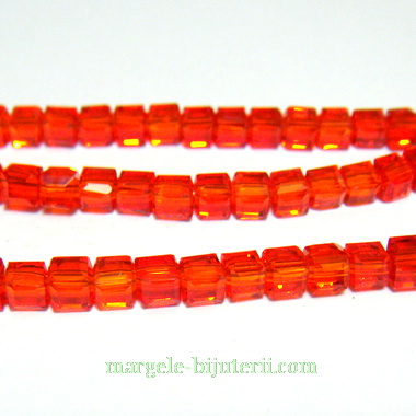 Margele sticla, rosii, cubice cu muchii tesite, 3.5x3.5x3.5mm, orificiu: 0.8mm. Pretul se refera la 1 bucata.